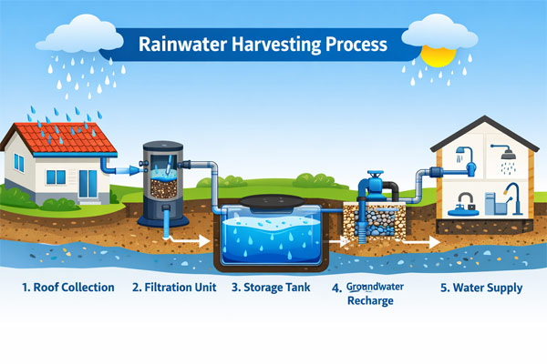 Homeowners can collect rainwater from rooftops and store it for gardening, cleaning, and groundwater recharge.